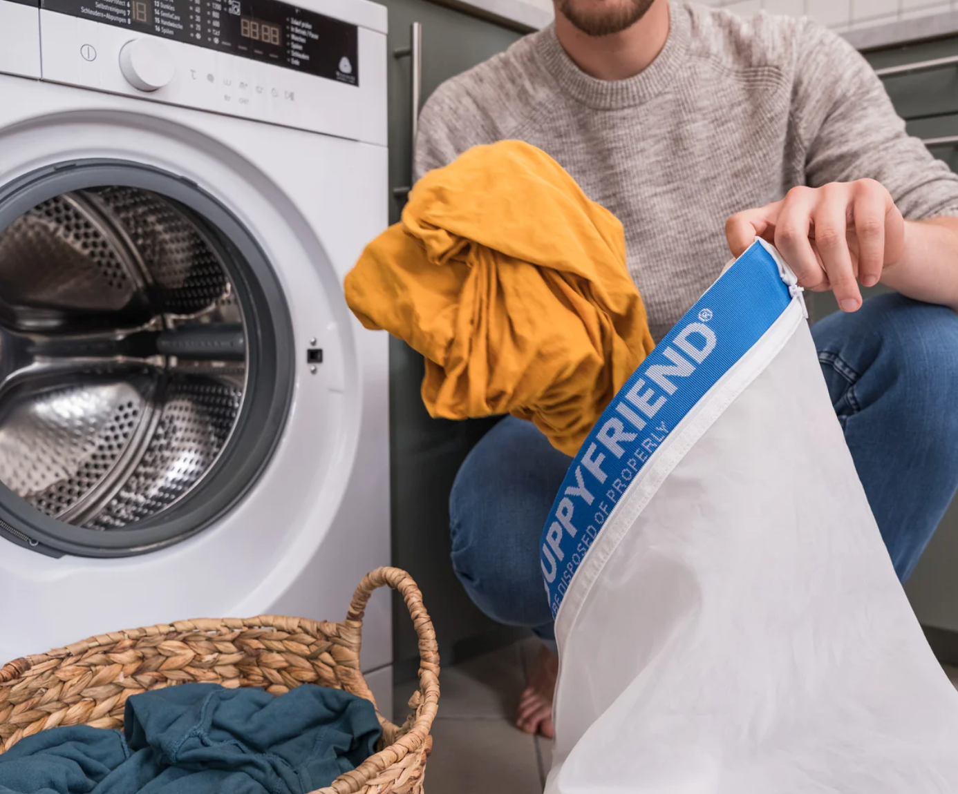 The Guppyfriend washing bag itself is made from a completely undyed and untreated material called Polyamide 6.6. When compared to the traditional method of putting clothing directly into the washing machine, the Guppyfriend Washing Bag reduces the number of fibers that shed from clothing by about 86%! With Guppyfriend, it's not just about the product they sell. It's about the difference they can make, one washing bag at a time.